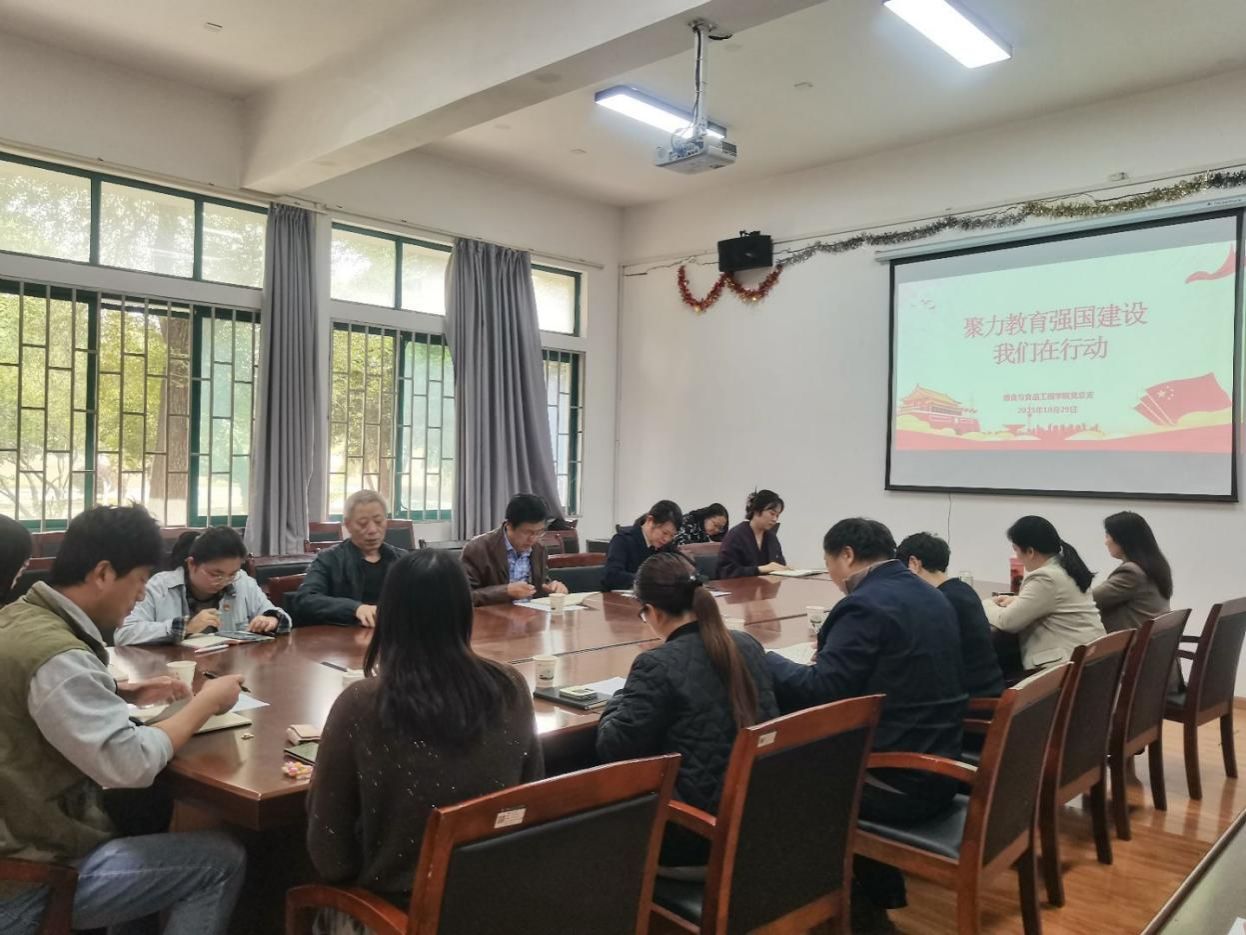 2025年10月29日下午2点,粮食与食品工程学院在知化楼101会议室举行“聚力教育强国建设,我们在行动”主题研讨活动。学校党委书记高连顺、联系校领导任秀霞出席会议,各专业教研室主任围绕怀进鹏部长关于教育强国建设的讲话精神和党中央“以教育数字化引领教育现代化”的部署,结合学院办学方针与自身工作实际,展开深入交流。粮工学院全体教师参会,会议由学院书记祝方清主持。