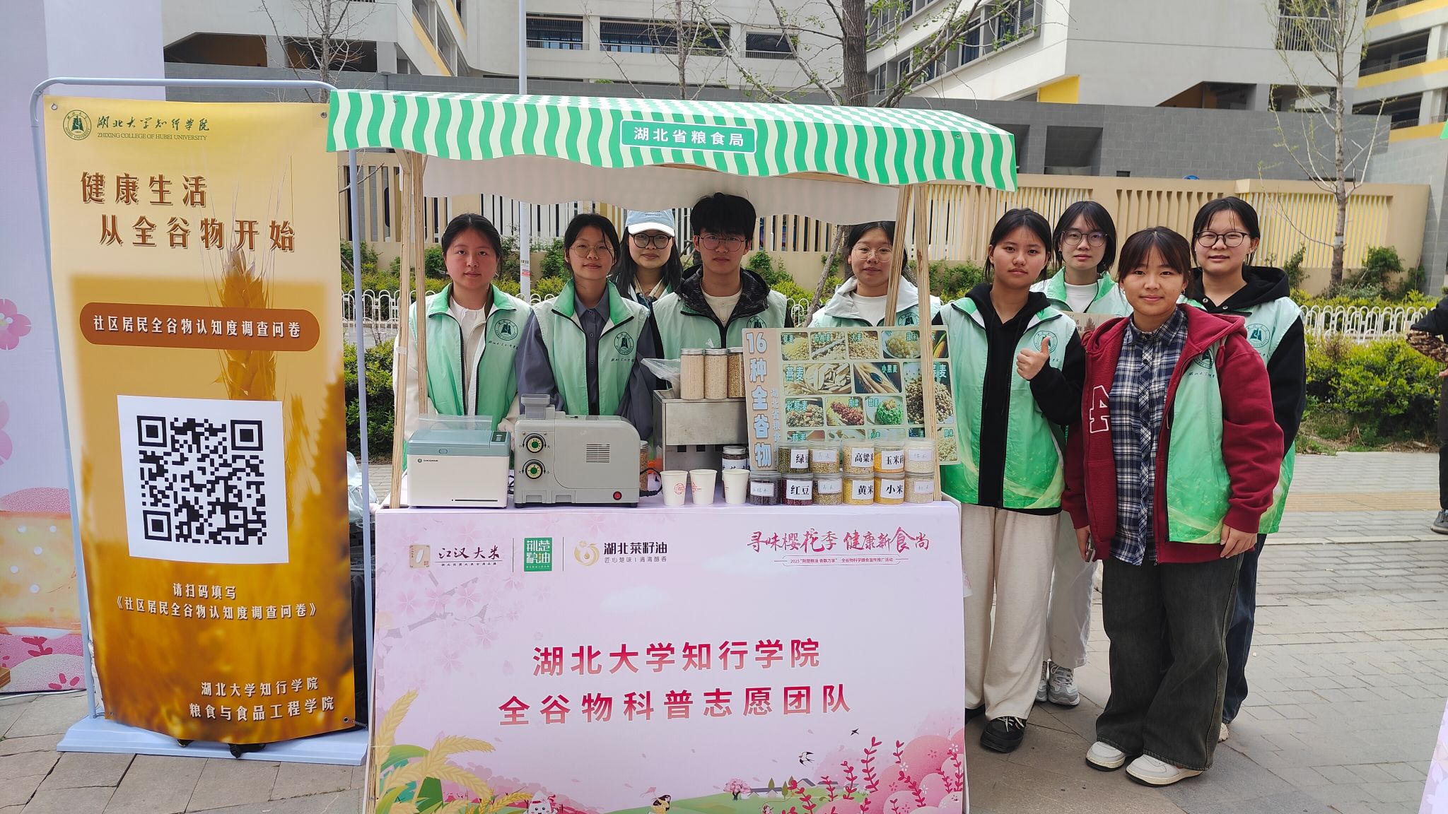 4月2日下午,武汉市硚口区丰景路蓝光林肯公园社区门前人声鼎沸,湖北省粮食局主办的全谷物科学膳食宣传推广活在此热烈举行。其中,我院的“从稻谷到餐桌”全谷物科普展台,格外吸引社区居民的眼球。