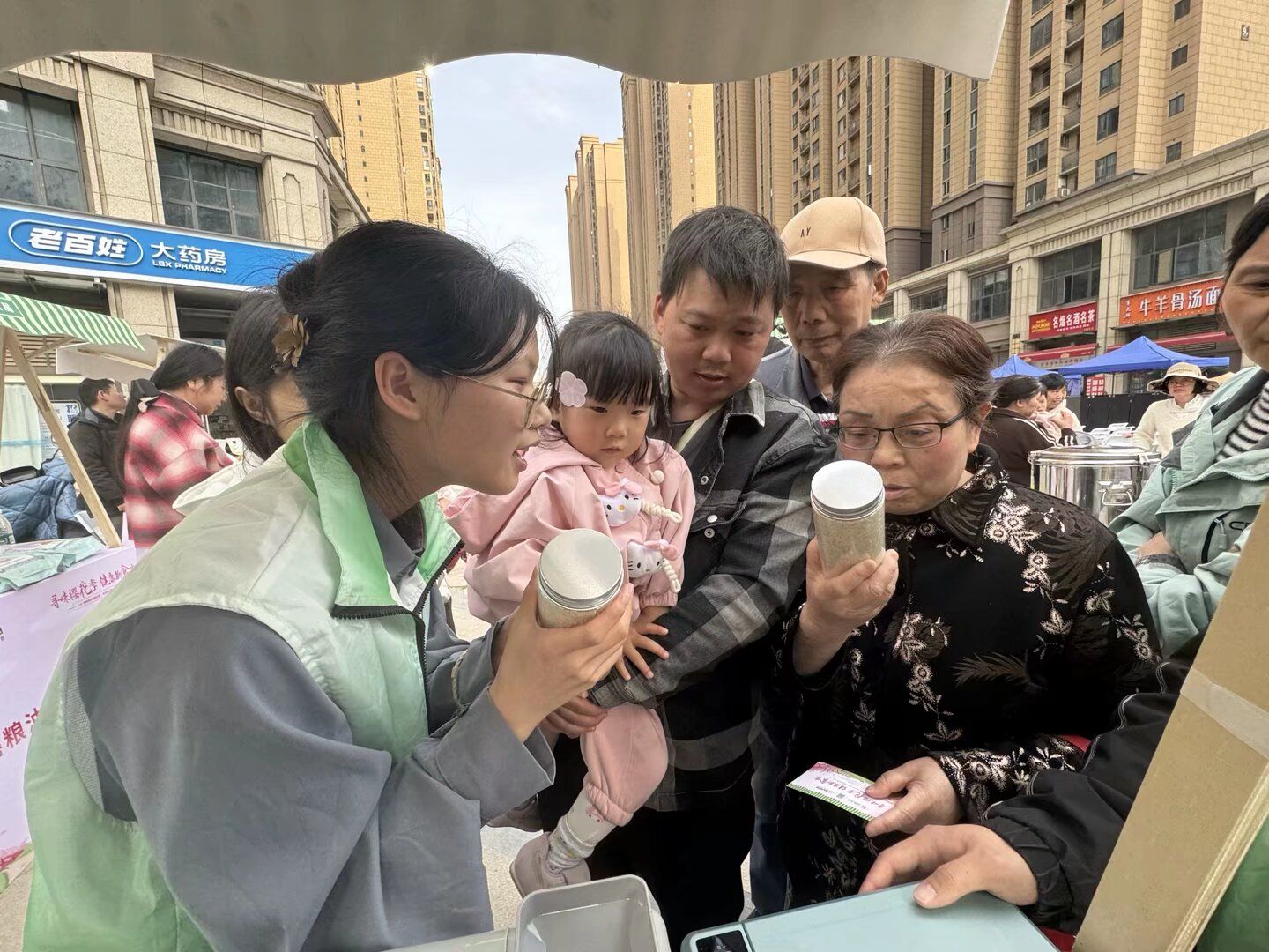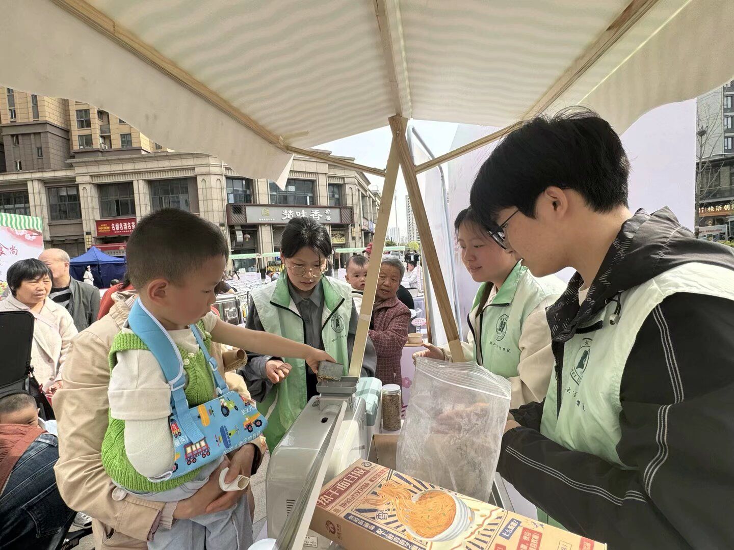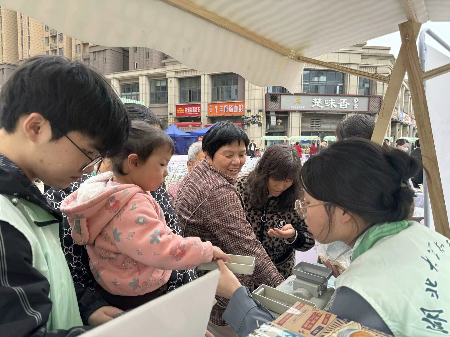 在活动现场,我院的师生们利用展板、实物及互动体验等多元化形式,形象地向居民展示了稻谷加工成大米的全过程。砻谷机、碾米机等稻米加工设备的展示尤为引人注目,小朋友们纷纷围在机器旁,满心好奇地观察稻谷是如何一步步蜕变成大米的,并有机会亲身体验操作过程。“原来我们每天吃的米饭是这样生产出来的!”一位小朋友兴奋地喊道。同时,我院志愿者们现场发放全谷物膳食宣传单,耐心引导居民填写调查问卷,收集民众对科学膳食的看法与建议。