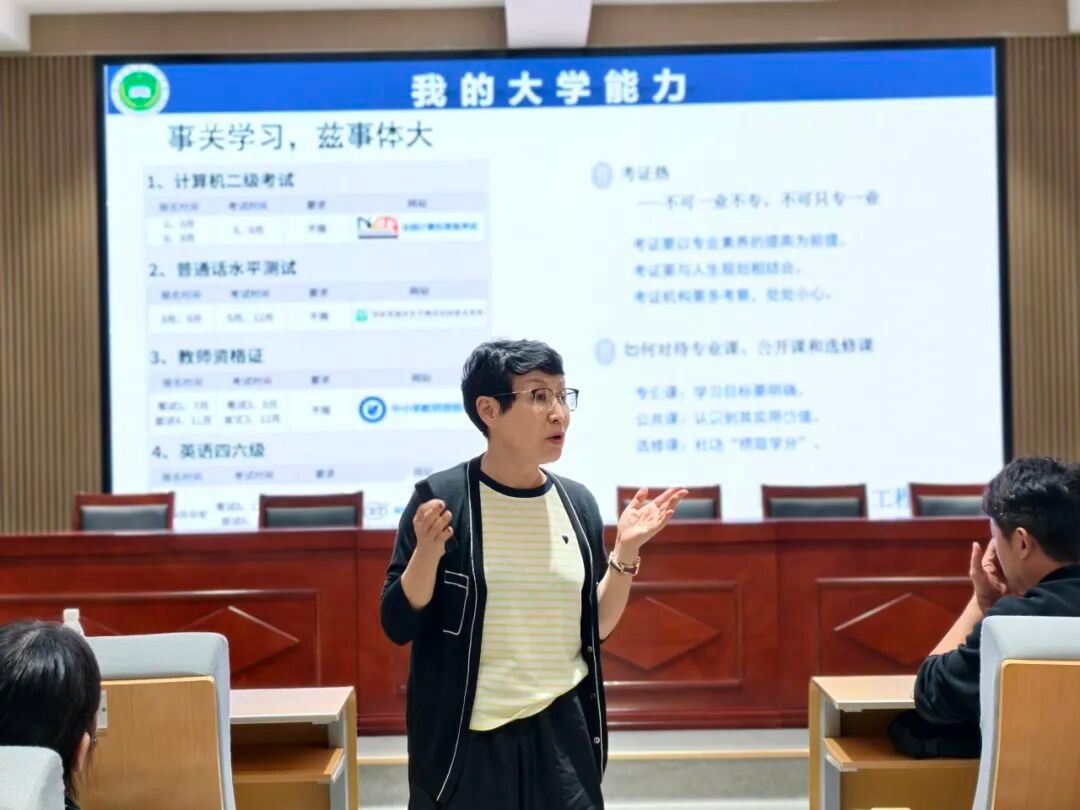 专业介绍结束后,学院党总支书记祝方清带来新生入学教育讲座,为同学们的大学生活“划重点”。祝书记没有堆砌生硬的条款,而是从“适应”“规划”“责任”三个关键词展开:既叮嘱大家要尽快适应从高中到大学的学习节奏与生活模式,也鼓励每个人提前规划学业目标,无论是考研深造、就业实践还是学科竞赛,都要尽早明确方向;最后,她特别强调“责任”二字,既是作为粮工学子对专业的敬畏,也是作为新时代大学生对自己、对社会的担当,让新生们在了解专业后,更清晰地知道“接下来该如何走”。