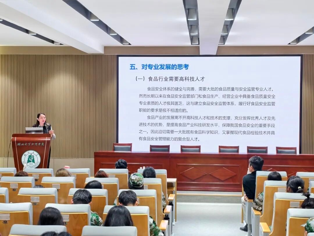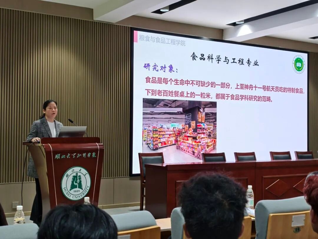 在专业介绍环节,四位专业老师依次登场,带来干货满满的“专业解读”:食品科学与工程专业的章焰老师,从“食品如何更安全、更营养、更美味”入手,拆解了专业涵盖的食品加工、检测、研发等核心内容,让同学们明白“吃”背后的科学逻辑;食品质量与安全专业的陈洁老师,则聚焦“食品安全防线”,结合日常食品抽检、质量管控等真实场景,清晰讲解了专业培养目标与就业方向,凸显“守护舌尖安全”的职业价值;酿酒工程专业的孙美玲老师,用“一瓶好酒的诞生”为线索,从原料甄选到酿造工艺,再到风味品鉴,将看似传统的酿酒行业与现代生物技术、食品工程相结合,展现专业的独特魅力;粮食工程专业的左祥莉老师,围绕“粮食的‘保鲜’与‘增值’”,详解粮食储藏、加工、物流等核心环节,让同学们读懂“把中国人的饭碗端得更稳”背后的专业支撑。